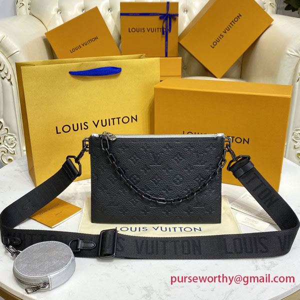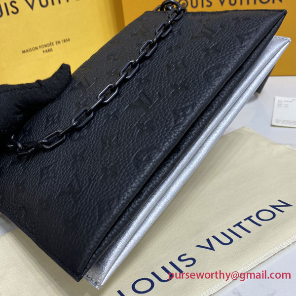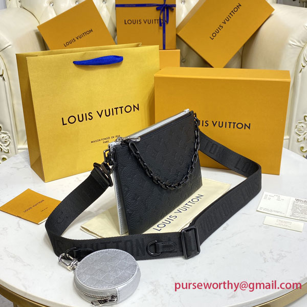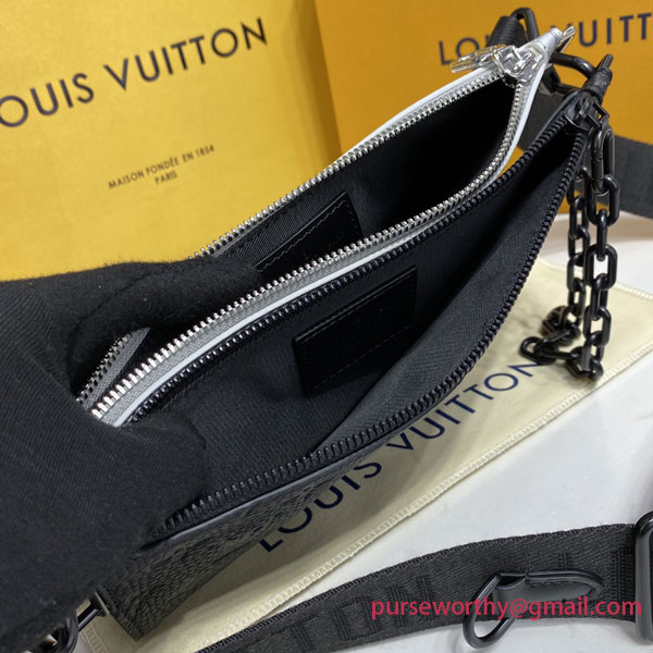 The modular Trio Pouch bag reflects the upbeat rave party spirit of Virgil Abloh’s “Amen Break” show for Spring-Summer 2022. This version mixing dazzling Damier Glitter leather with sumptuous black Taurillon Monogram leather is accented with a black chain. Two main compartments plus a detachable round pouch and a Jacquard strap make it an eye-catching, practical day-to-evening companion.