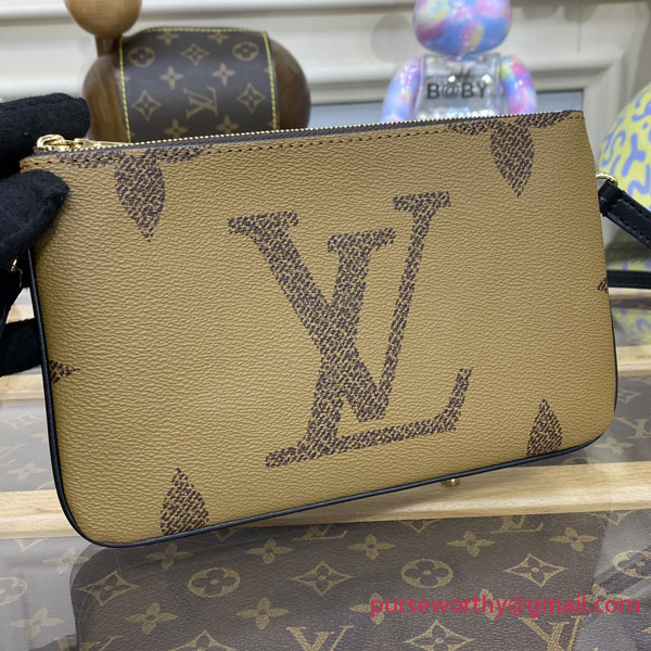 Timeless Monogram and on-trend Monogram Giant Reverse canvas combine on the Double Zip Pochette, which comes with a removable, adjustable leather strap for multiple carry options. This versatile pouch features two zipped pockets to organize everyday essentials, one of which contains three card slots. The middle space offers easy access to items like tickets.