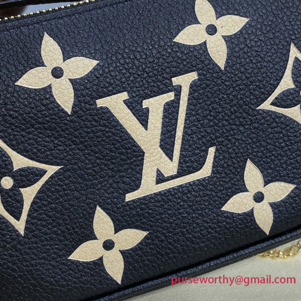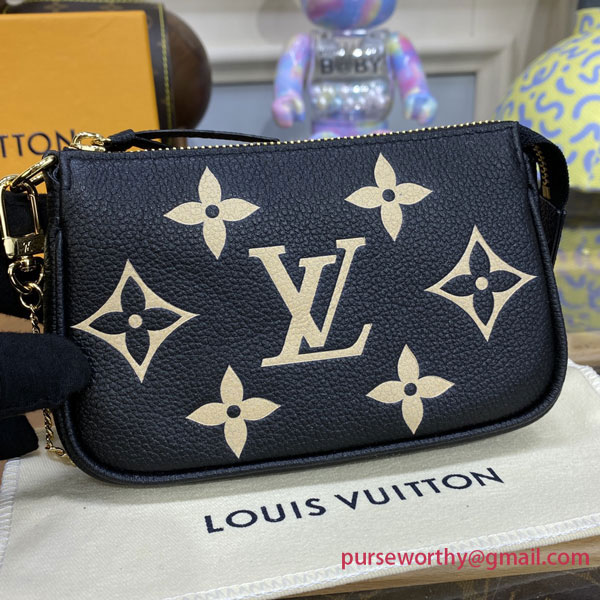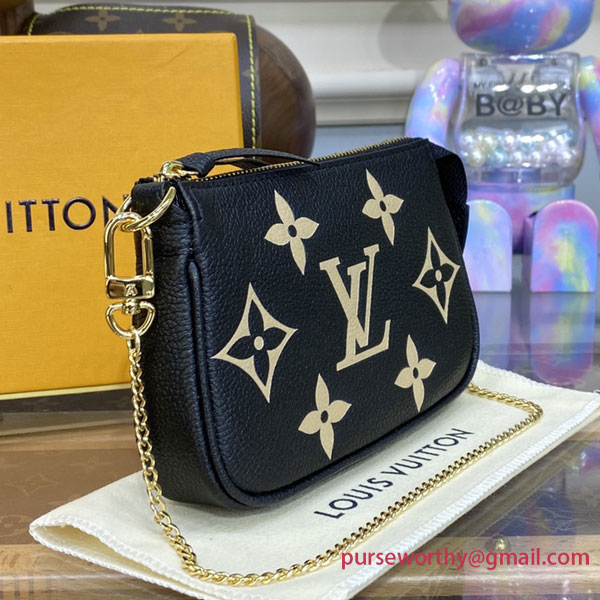 The Mini Pochette Accessoires wears an air of timeless chic in this two-tone edition, crafted from Monogram Empreinte leather embossed with a contrasting Monogram Medium motif. Accented with a golden chain and gleaming hardware, this elegant little pouch can be carried on its own, or attached to a larger bag.