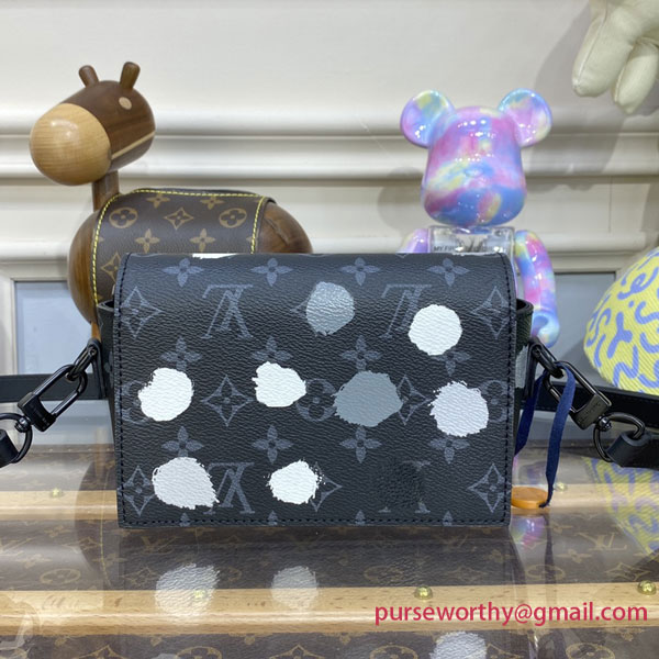 Part of the exclusive new Louis Vuitton x Yayoi Kusama collaboration, the LVxYK Steamer wearable wallet was inspired by a recurrent theme in the renowned Japanese artist’s work: dazzling arrays of dots. Screen-printed in shades of gray on Monogram Eclipse canvas, the pattern has a strikingly realistic hand-painted effect. A practical hands-free wallet and a celebration of art and craftsmanship.