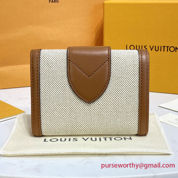 This refined interpretation of the LV Pont 9 compact wallet combines natural canvas with cowhide leather. The design is complemented by the oversized LV Circle closure in gold-tone metal. Though compact in size, this wallet offers a variety of practical pockets and six card slots.