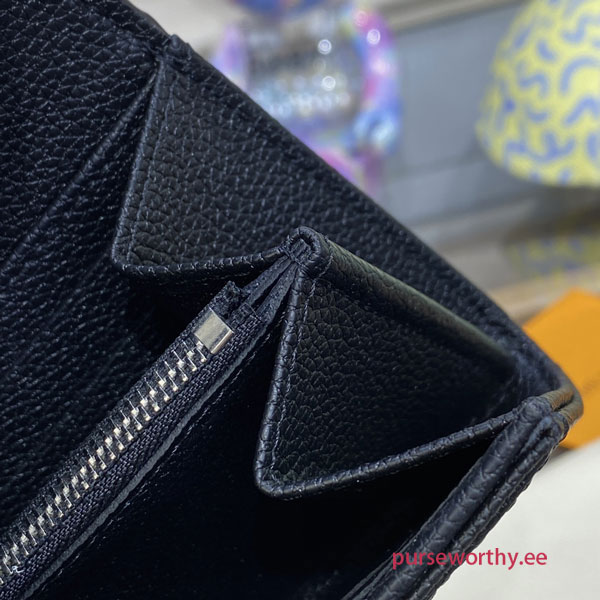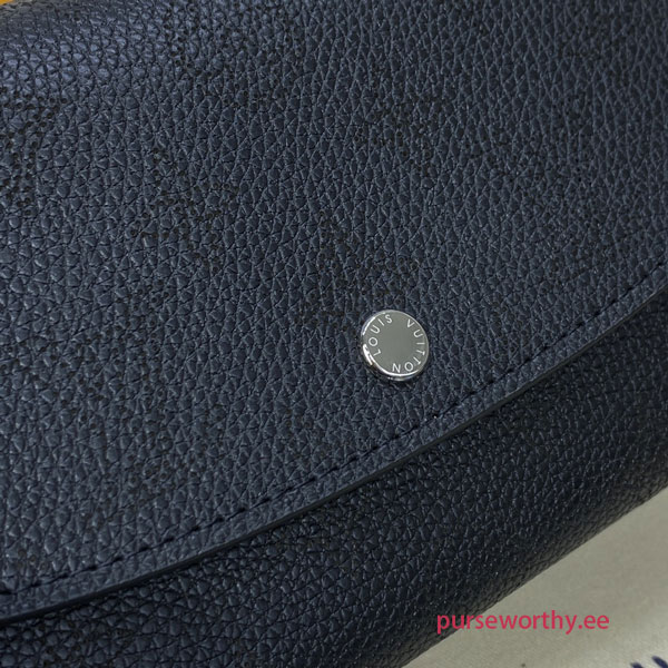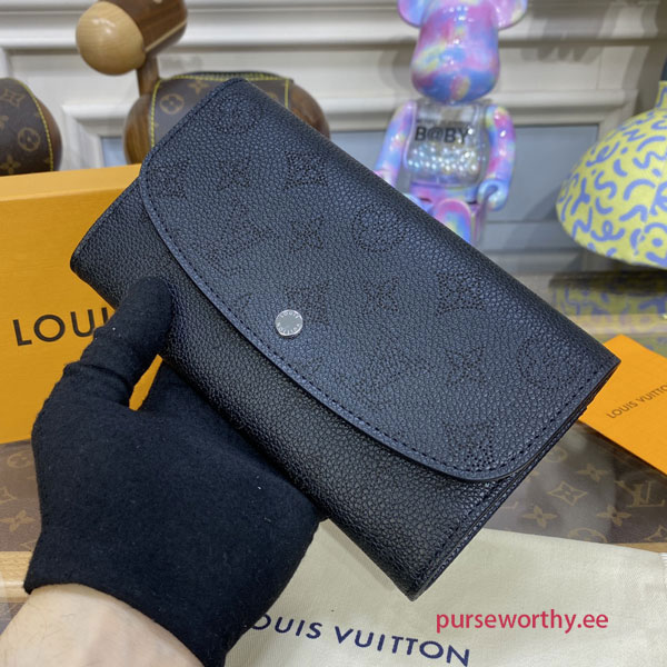 The sophisticated Iris wallet is crafted from Mahina leather, an exceptionally supple calfskin with delicate Monogram-pattern perforations. Its feminine, rounded flap opens to reveal two roomy compartments, a zipped pocket for coins and numerous card slots. This wallet is notable for refined details, such as its engraved, silver-tone press-stud.