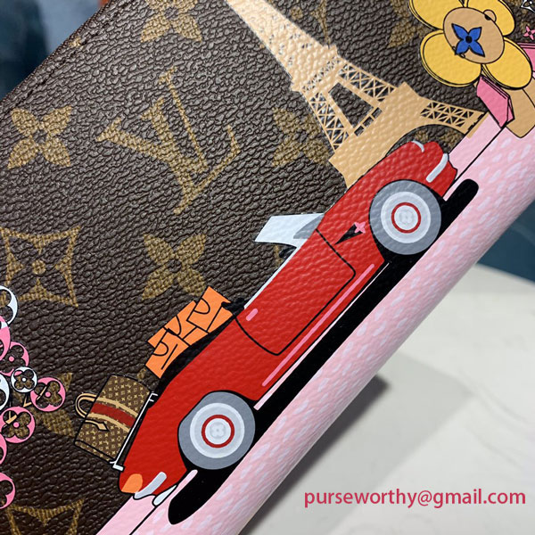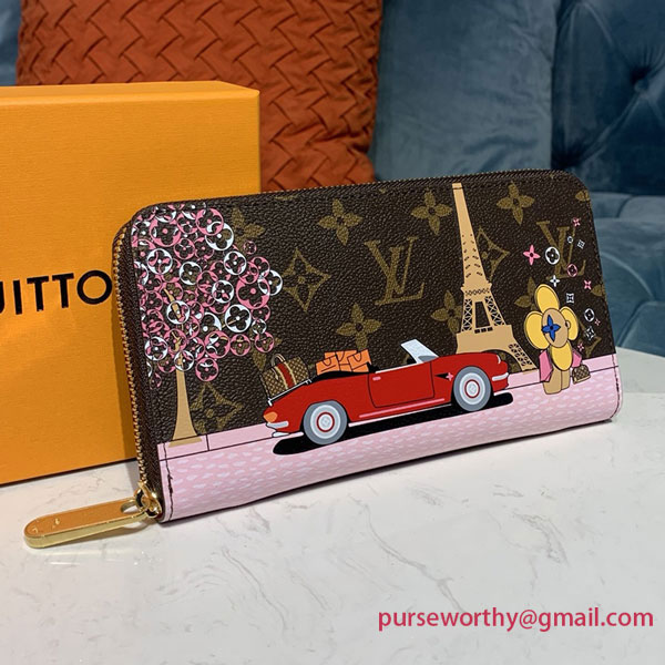 The iconic Zippy Wallet in Monogram canvas comes in a playful Holiday edition inspired by Louis Vuitton's travel heritage. It stars House mascot Vivienne, who is pictured driving by the Eiffel Tower in Paris. This colorful and practical accessory makes a perfect gift for travelers, Monogram lovers and Louis Vuitton collectsors.