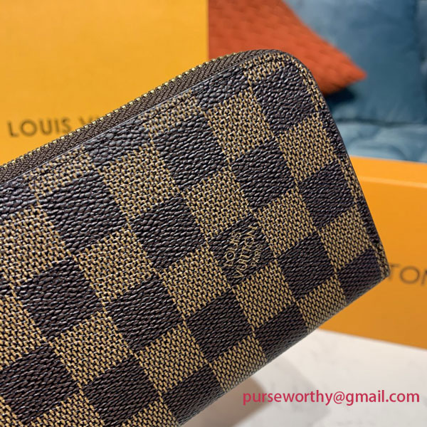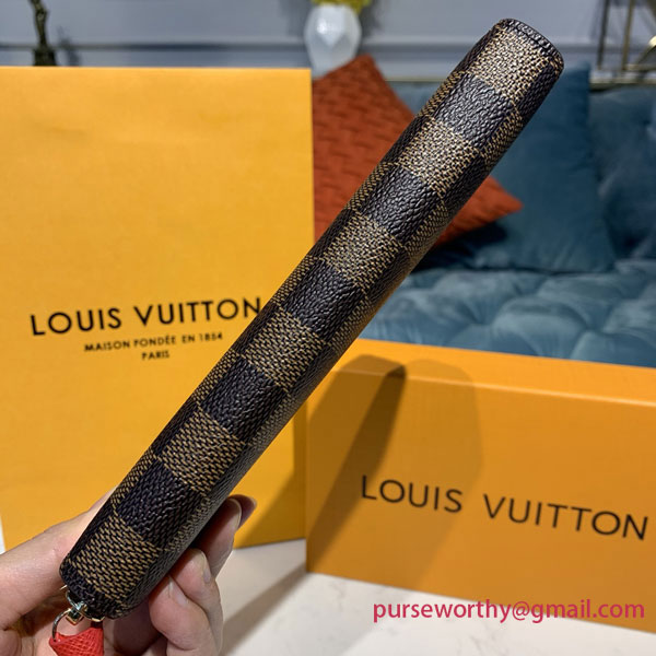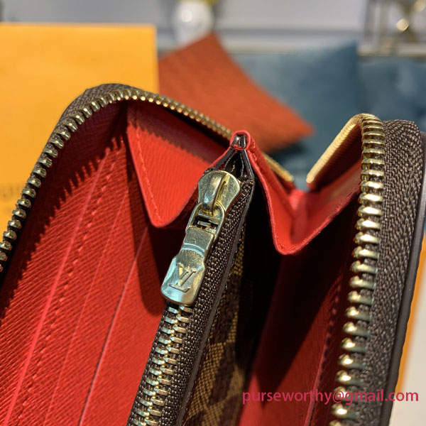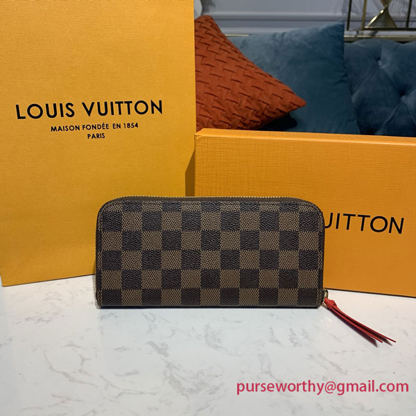 The Clémence wallet combines Louis Vuitton's historic Damier Ebene canvas with a colorful grained-leather lining. This slim-line design unzips to reveal a well-organized interior with two large compartments, a zipped coin pocket and several card slots. Finished with a refined leather zip pull, it can also be carried as a clutch.