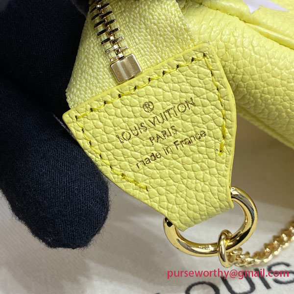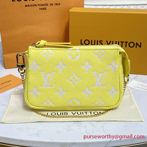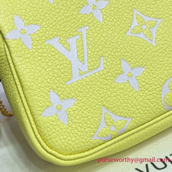 For the Mother's Day special edition, the Mini Pochette Accessoires is revisited in pastel-hued Monogram Empreinte leather with the embossed Monogram pattern picked out in white. Ideal for esssentials, this stylish mini pouch can be carried as a clutch or hung from a bag or belt by its gold-tone chain.