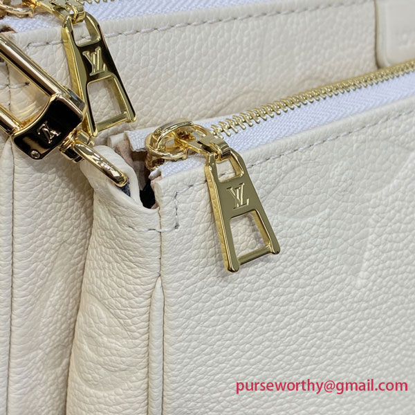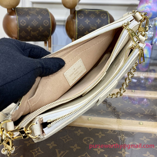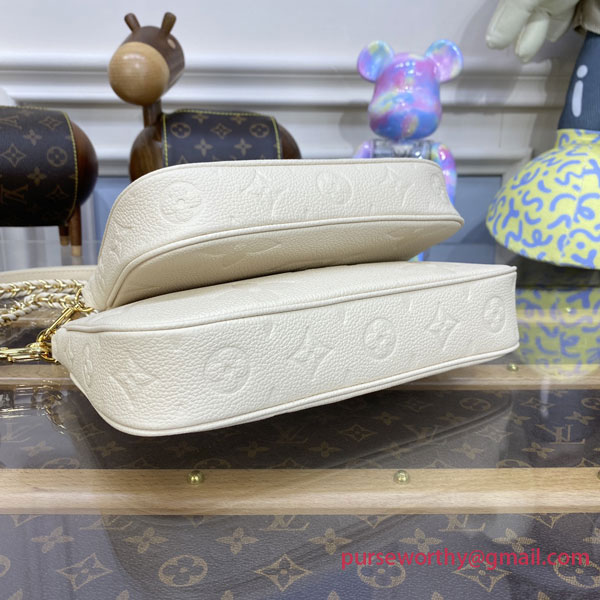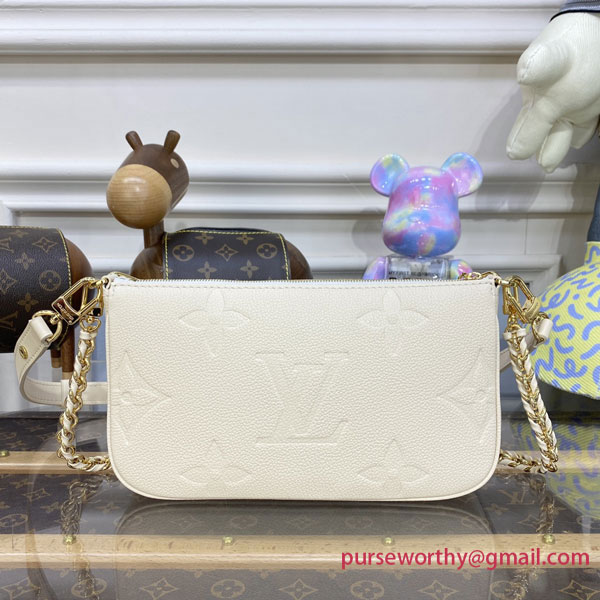 Made from cream-colored Monogram Empreinte leather, the Multi Pochette Accessoires handbag is composed of two pouches attached together. Both pouches are lined with matching cream-color microfiber, with the larger pouch also including an inside pocket. Thanks to a chain and a strap, both removable, this bag becomes very verstaile.