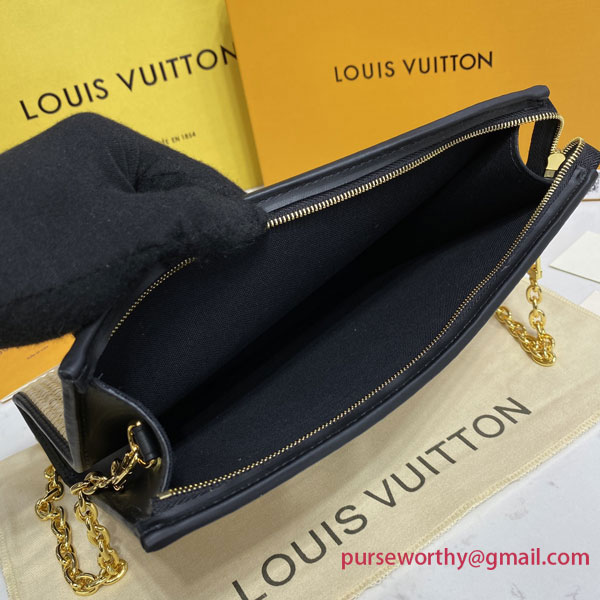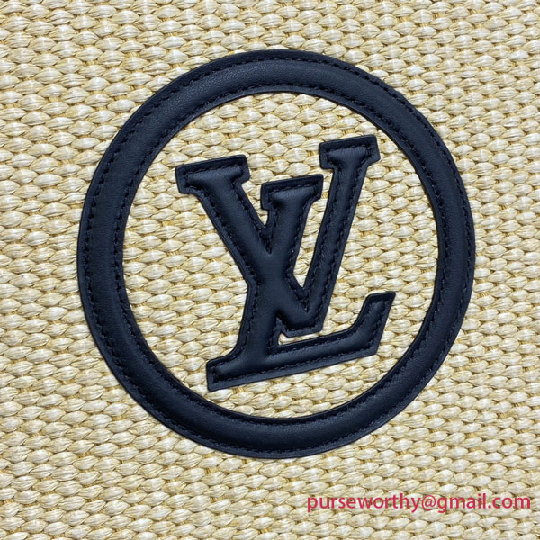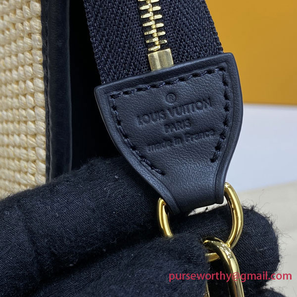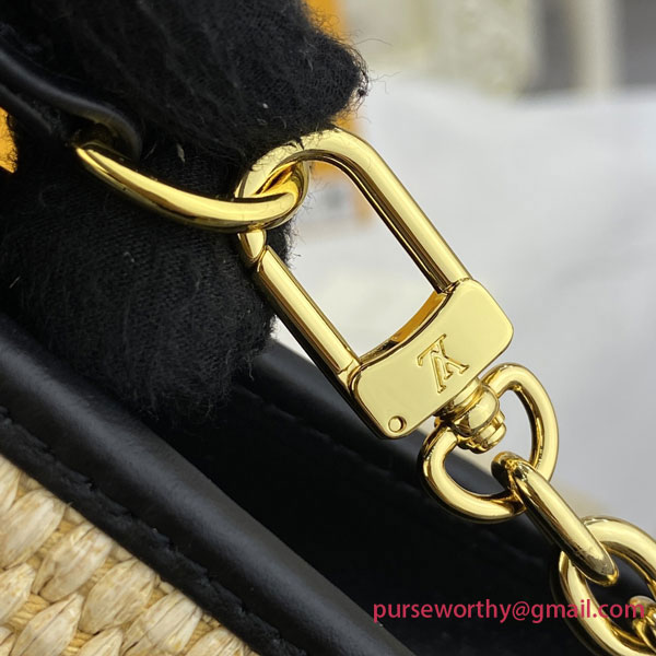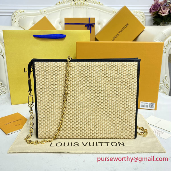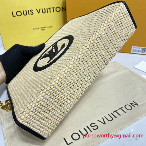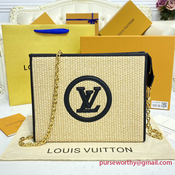 The Toiletry Pouch on Chain is crafted from natural raffia, complemented by black leather for the trim and LV Circle logo on the side. This model was inspired by the cosmetic Toiletry Pouch, created in 1901, which Louis Vuitton clients also used as a clutch. This reworked design has a removable, gold-tone chain for hand or shoulder carry.